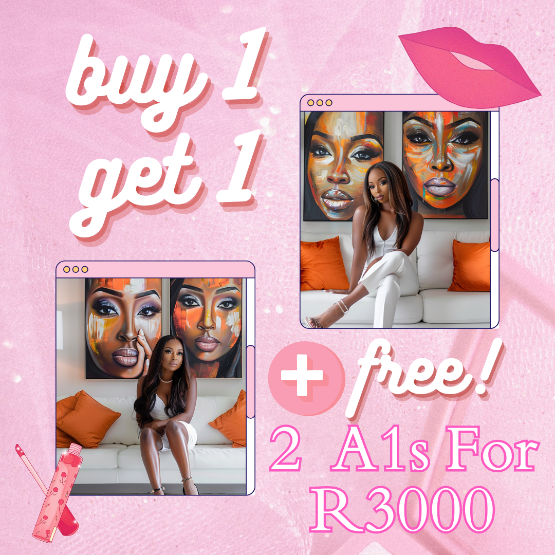 This month only: buy 1 “Gilded Gaze” A1s canvas and get 1 free for just R3000! Enhance your space with these stunning portraits. Don’t miss out on this limited-time offer!